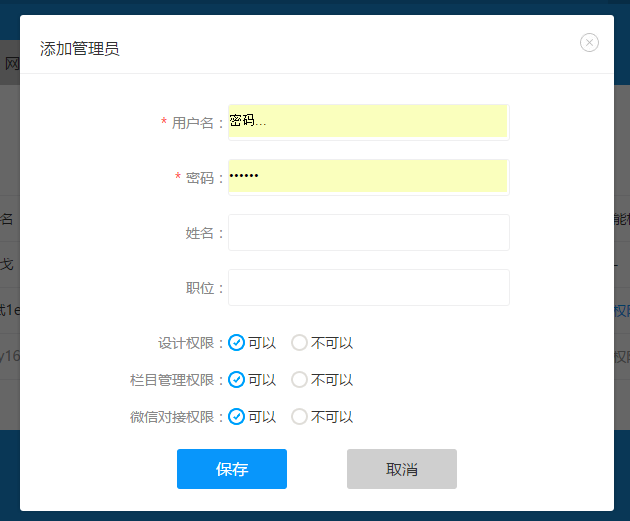 添加管理员:可以设置是否有设计权限,栏目管理权限,微信权限等