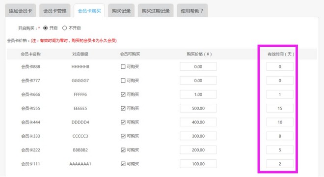 一、设置会员卡的有效期:您可以根据您的实际情况来设置会员卡是否可购买和会员卡的有效时间。