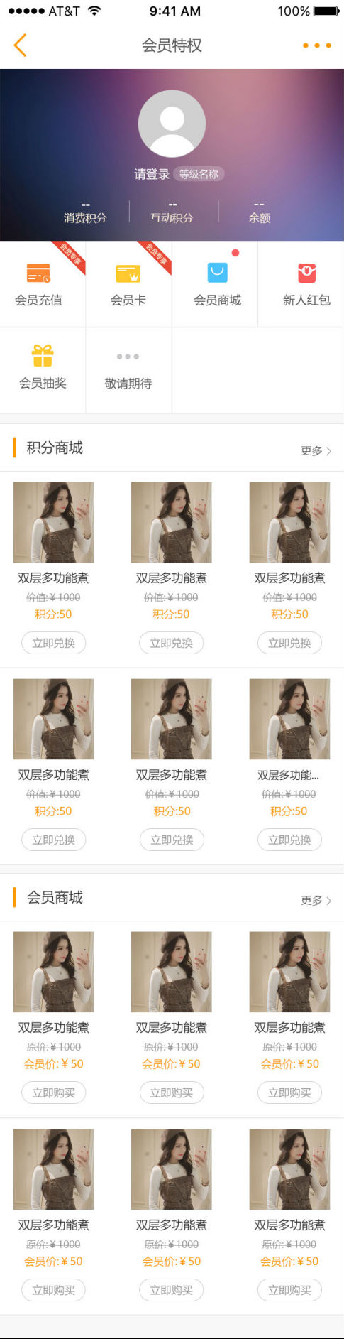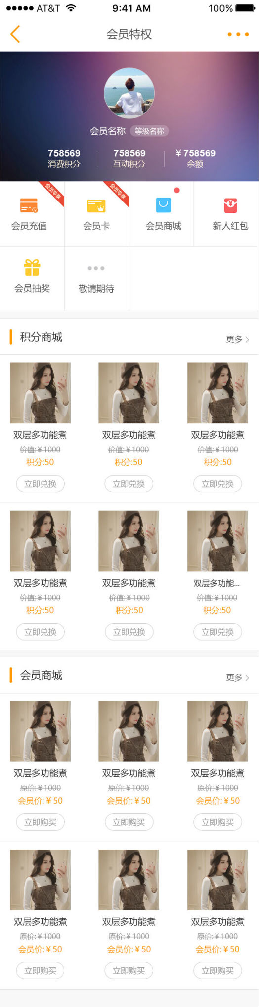 会员特权功能中展示升级成为会员享有的所有积分、余额、会员卡、会员商城、积分商城、新人红包、会员抽奖和会员签到等功能(目前只支持手机端)。