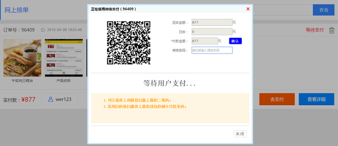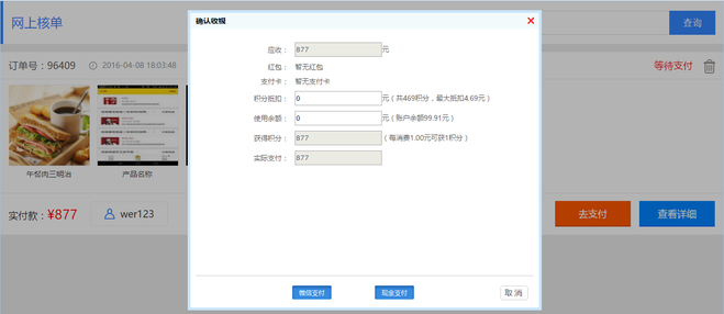 O2O收银台线下核单功能上线O2O收银台线下核单流程: 用户通过PC网站或微信网站或APP下单->客户线下到店->店员使用OA-收银台功能->客户微信支付或现金支付订单->提货或核销->将订单改为已完成 1、用户通过PC网站或微信网站或APP下单 2、客户线下到店取货或核销 3、店员打开OA-收银台 店员通过扫码枪扫描客户二维码或订单二维码,也可以输入会员手机号、姓名、订单号等信息查询 扫码抢扫描订单二维码或会员二维码 查询结果 4、微信支付或现金收银,找到订单后点去支付(微信支付或现金),以微信支付示例: A、让用户通过微信,扫描生成的二维码: 扫描成功后,客户的手机界面如图: B、让用户打开微信钱包->付款->OA收银台光标定位到微信条码->扫码抢扫描客户的付款条码确认->完成支付 支付成功界面: 用户支付成功后,OA收银台的界面会自动变为支付成功: 5、提货或核销,然后可以设置现场提货或等待配送,这时的订单状态已变为“已支付” 6、如果设为现场提货,这时的订单状态会变成"订单完成" 如何查看客户订单或会员二维码: A、微信公众号->手机网站->会员中心->我的订单->订单列表->查看二维码 B、微信公众号->手机网站->会员中心->会员应用->会员二维码 如何配置微信扫码支付: 1 进入微信公众平台,选择微信支付 2 选择开发配置->扫码支付. 支付回调地址的URL为 http://您的已备案并且与微信绑定的独立域名/pay/wxpay/native_notify.php |