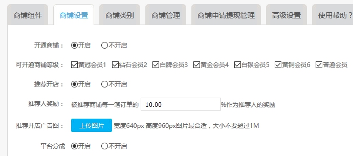 一、开启邀请开店功能。 a) 推荐人奖励:被邀请的会员开通商铺后,商铺的每一笔订单的百分比当做给推荐人的奖励,这个奖励是后台给的不会从商铺账号中扣除,建议设置成0.01(万分之一)。