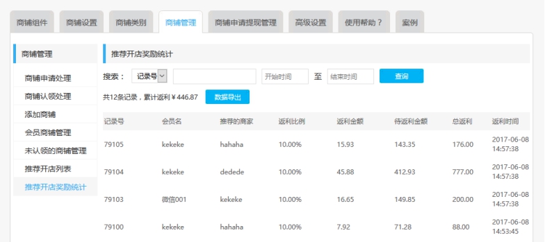 三、被邀请会员开店后,邀请人可获得奖励(邀请人获得的奖励并不是从商家账户中扣除)。 a) 查看推荐开店列表