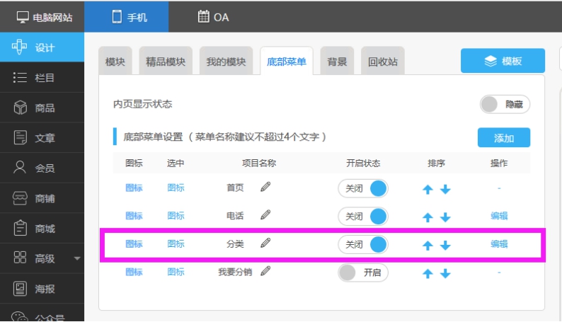 二、点击编辑,即可设置产品栏目是否显示和显示的排序。