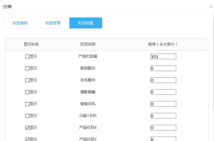 产品分类功能新增可设置产品栏目是否显示和栏目显示的排序~