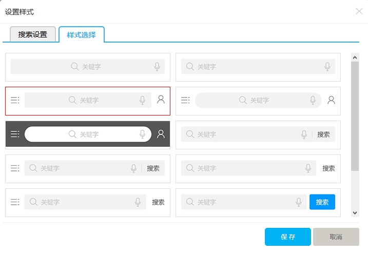 2、样式选择:系统提供11种常见的搜索样式供您选择,其中语音功能您对接了微信语音搜索后才会显示。(3/4/5中左侧是菜单,右侧是会员中心)。