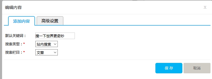 3、编辑内容:默认关键词、搜索类型(站内和站外)、搜索栏目。