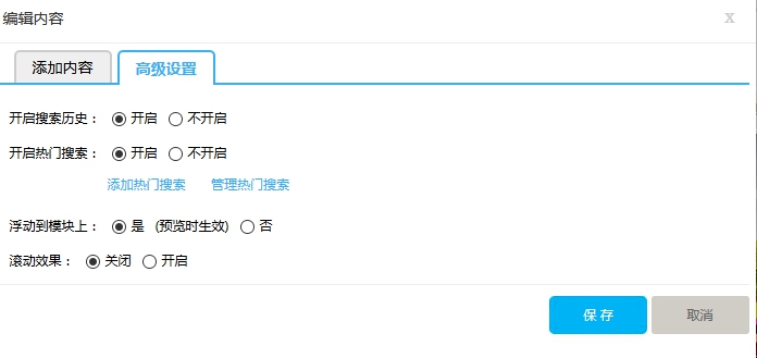 4、高级设置:搜索历史、热门搜索、浮动到模块上、滚动效果。 a) 搜索历史:会员登录后,通过系统搜索搜索的关键词系统可以记录下来,展示到页面上。 b) 热门搜索:在搜索页面上显示您设置的内容。 c) 浮动到模块上:“系统搜索”不占位置,直接浮动到搜索模块下的其他模块上,例如banner上。 d) 滚动效果:可设置滚动到什么位置后改变搜索的背景颜色和背景颜色的透明度。